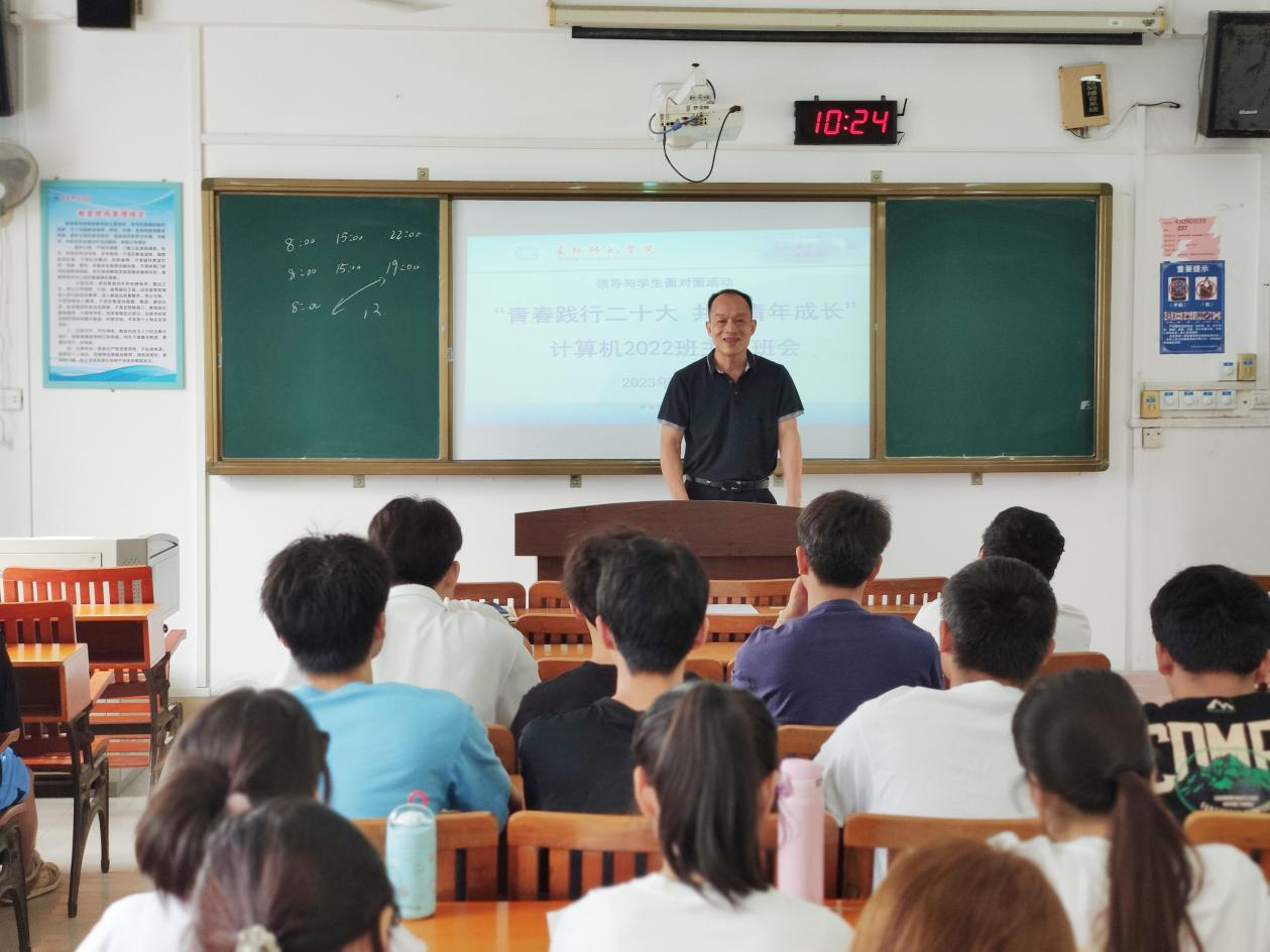 5月23日,学校党委武装部部长、保卫处处长吴坚文深入乐天堂f88计算机2022班开展“青春践行二十大 共话青年成长”主题班会,乐天堂f88团委书记、该班班主任、全体同学参加了此次班会。