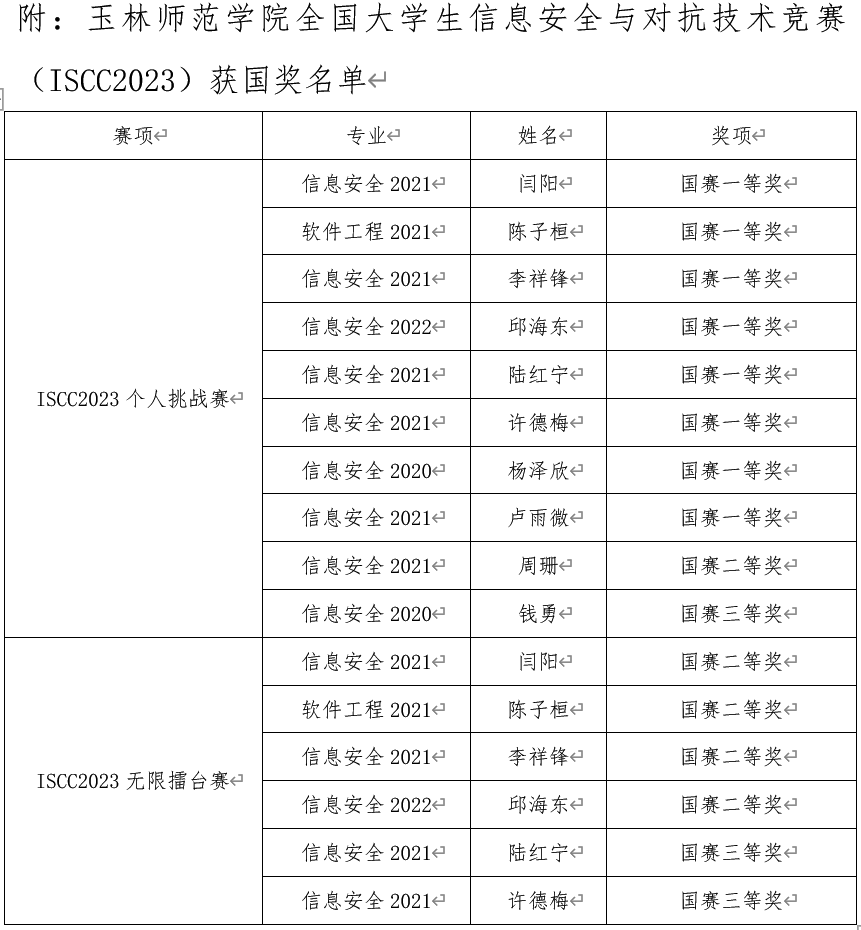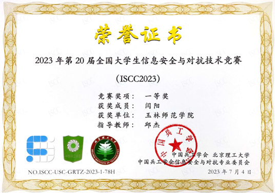 近日,全国大学生信息安全与对抗技术竞赛(ISCC2023)成绩揭晓,乐天堂f88代表队由乐天堂f88,乐天堂f88学子组成,并在邱杰老师的带队指导下荣获第20届全国大学生信息安全与对抗技术竞赛全国一等奖8项、二等奖5项、三等奖3项。