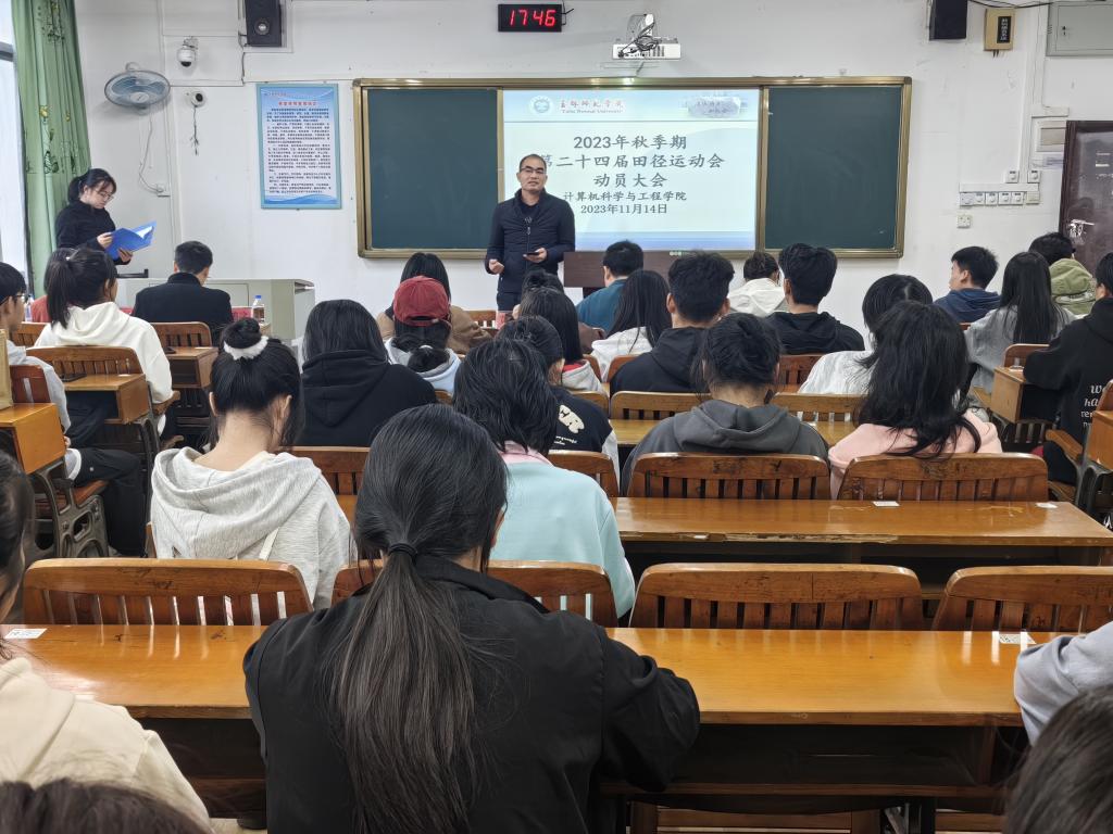 11月14日下午,乐天堂f88于东校区厚德2402召开学校第二十四届田径运动会动员大会。乐天堂f88党委副书记兼副院长黄潮、团委书记、辅导员、教练员以及运动员参加此次大会。该大会由辅导员何欢欢主持。