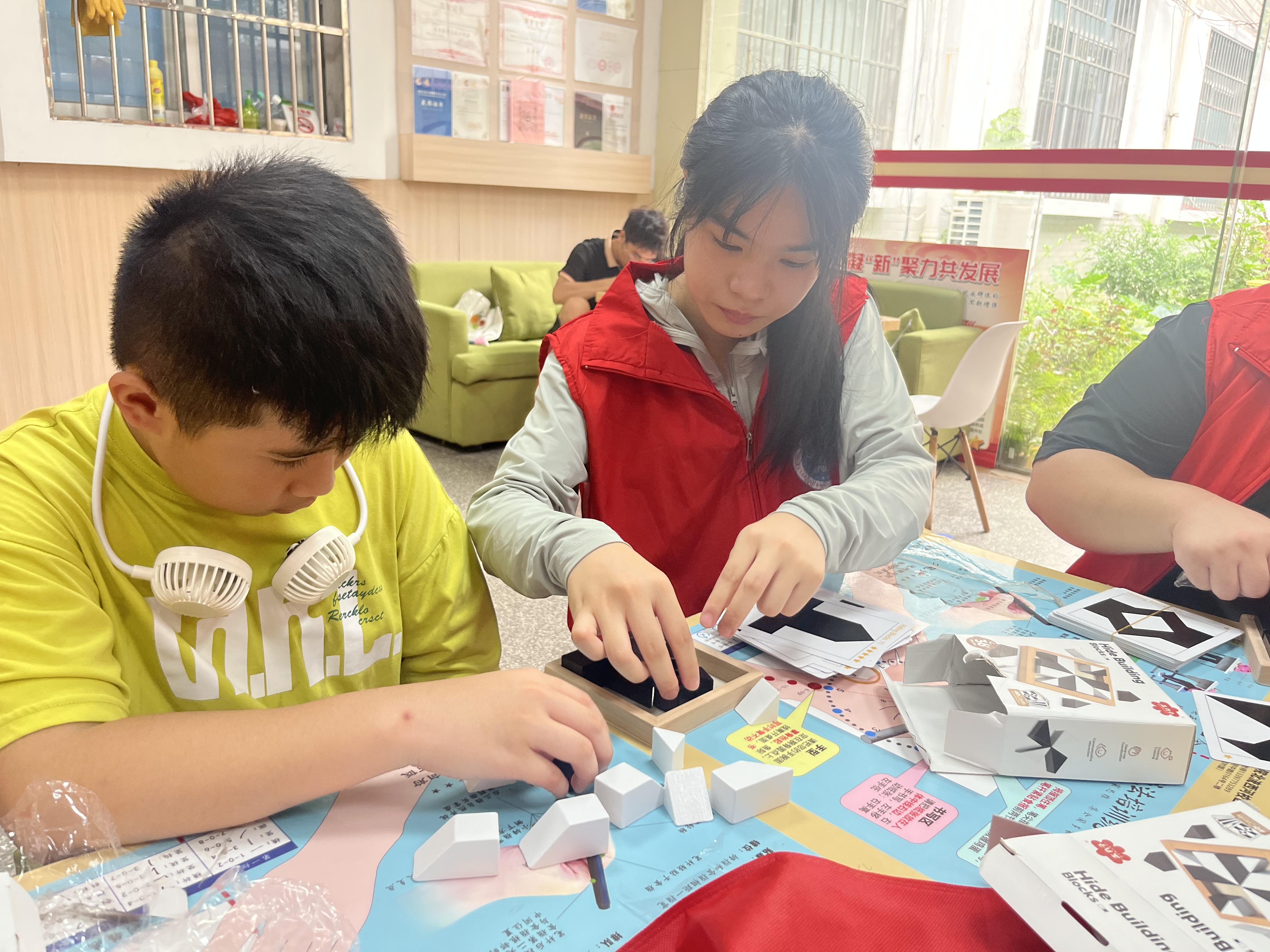 除了科技体验,思维训练积木游戏同样备受欢迎。志愿者们根据小朋友的年龄层次分组,发放不同难度的积木套装,引导他们动手搭建、创意组合。孩子们在拼搭中锻炼逻辑思维与空间想象力,完成作品后还主动分享创作思路,现场洋溢着积极探索的氛围。