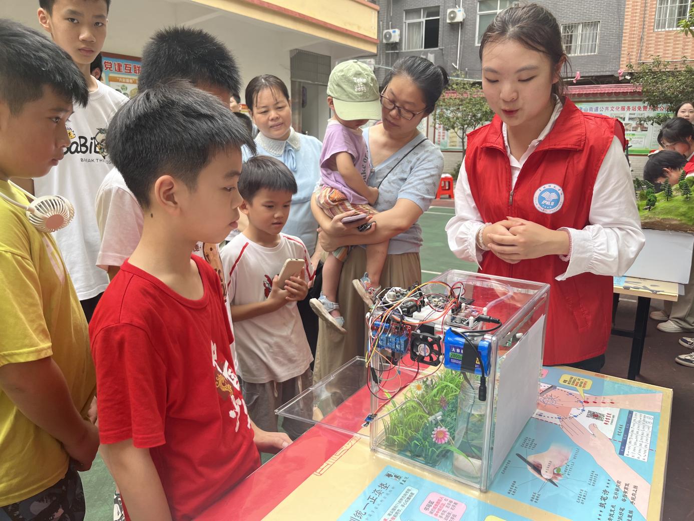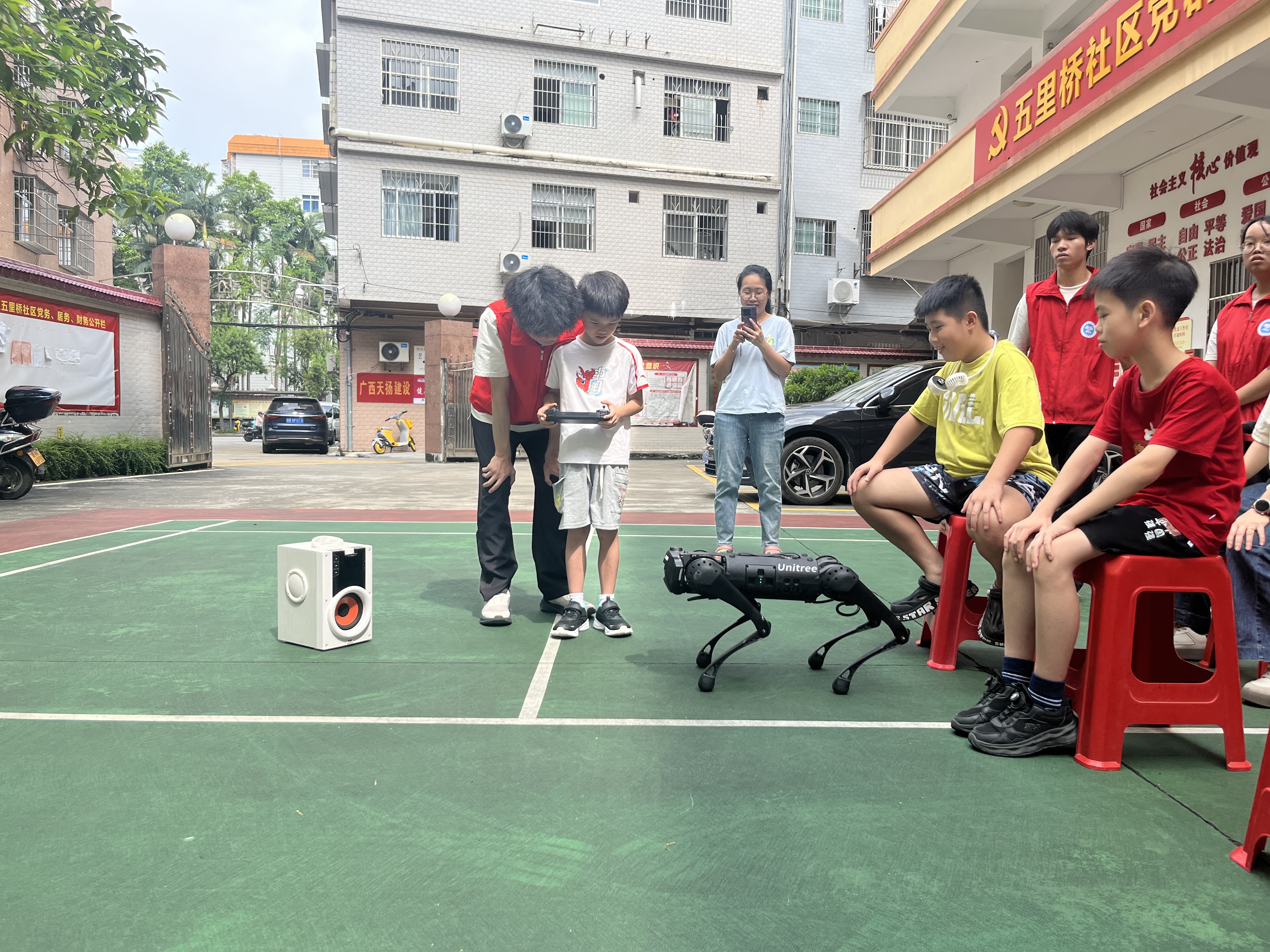 在活动现场,志愿者们带来了一系列前沿科技成果:能完成行走、跳跃、跟随指令的机器狗灵活穿梭,引得小朋友们阵阵惊呼;模拟山体滑坡预警的监测模型、展现生态系统运行的监测模型,直观呈现了科技在自然灾害防治与生态保护中的应用;而可监测老人健康数据的智能拐杖,则让大家看到了人工智能对民生福祉的切实助力。志愿者们一边操作演示,一边用通俗易懂的语言讲解背后的技术原理,将复杂的人工智能知识转化为生动的现场教学。
