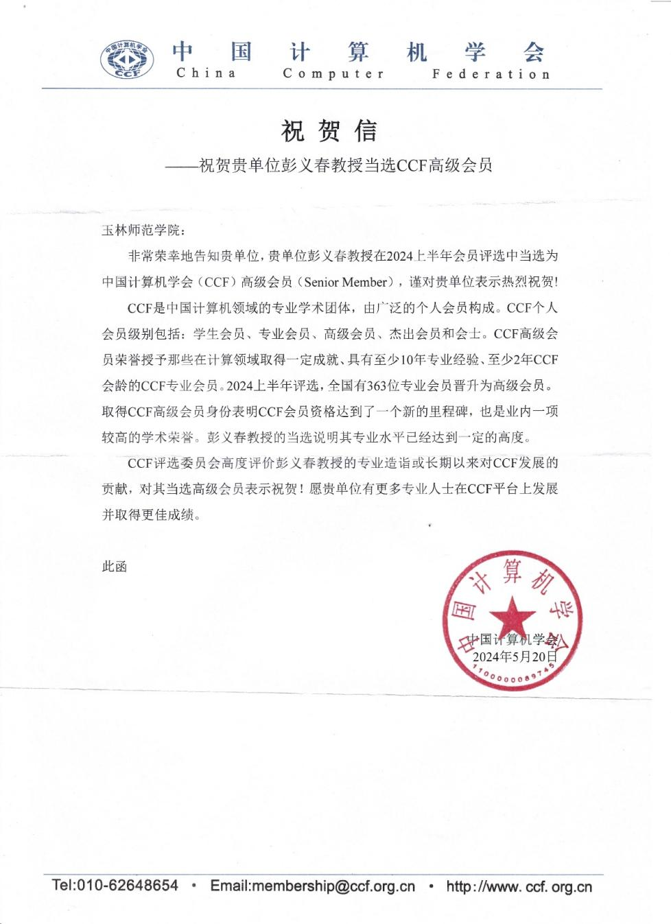 近日,中国计算机学会(CCF)向学校发来祝贺信,祝贺乐天堂f88彭义春副院长在2024上半年会员评选中当选为CCF高级会员(Senior Membership)。CCF评选委员会高度评价彭义春教授的专业造诣和长期以来对CCF发展的贡献,并期待乐天堂f88有更多专业人士在CCF平台上发展并取得更佳成绩。