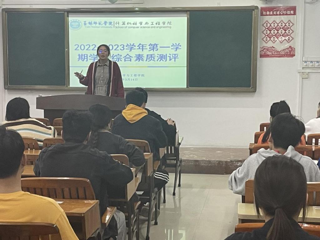 林依欢对2022—2023学年学生素质测评需要注意的地方进行强调。并结合学生日常学习、生活、实践等方面的具体事例,逐条分析解读了各模块的素质测评指标。